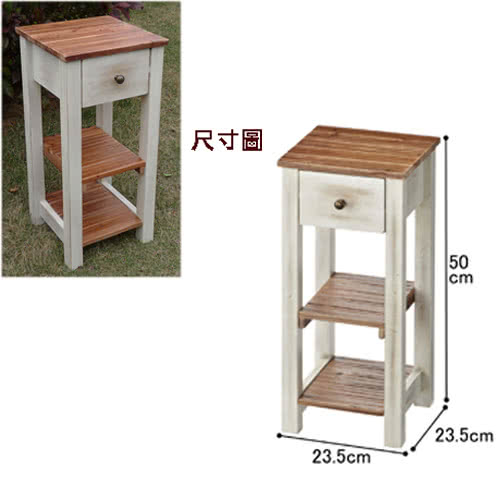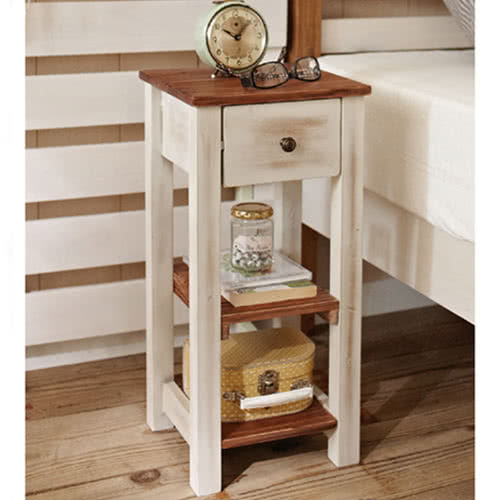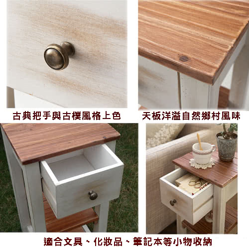 《鄉村趣》古木調側邊桌收納台,可愛的小巧造型適合放置於沙發或者床邊當成側邊桌使用,上面有一個收納的小抽屜,收納文具、筆記本、乳液等小物非常適合,下方則有兩層置物層板,只要在天板鋪起一片優雅小方巾,擺放盆栽來裝飾,您的居家質感立即提升,是喜愛鄉村風格的您最佳的選擇!